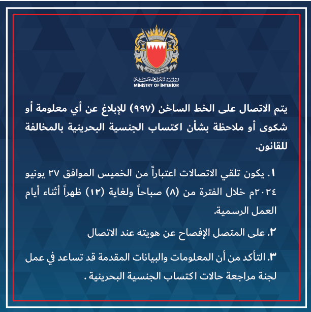 أعلنت وزارة الداخلية ، تخصيص الخط الساخن (997) للإبلاغ عن أي معلومة أو شكوى أو ملاحظة بشأن اكتساب الجنسية البحرينية بالمخالفة للقانون ، حيث يكون تلقي الاتصالات اعتباراً من الخميس الموافق 27 يونيو 2024م خلال الفترة من 8 صباحاً ولغاية 12 ظهراً أثناء أيام العمل الرسمية.