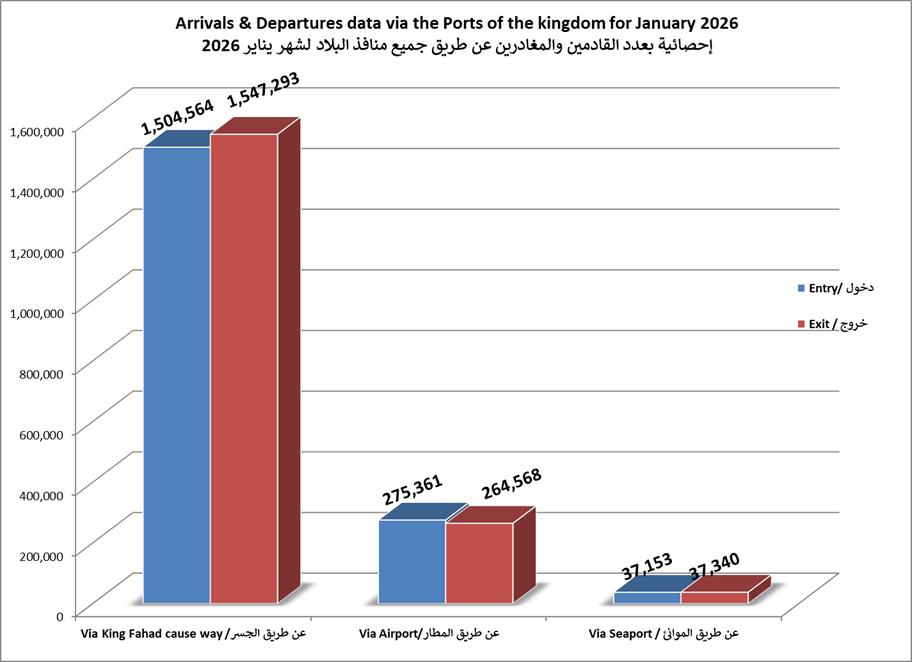 الاحصائيات الشهرية لحركة المسافرين عبر جميع منافذ البلاد لعام 2026