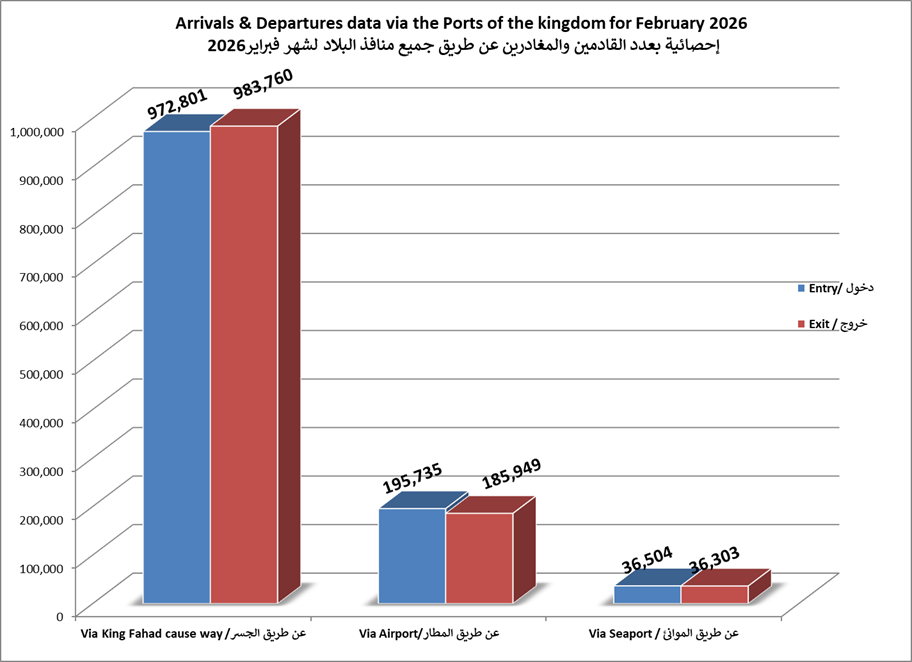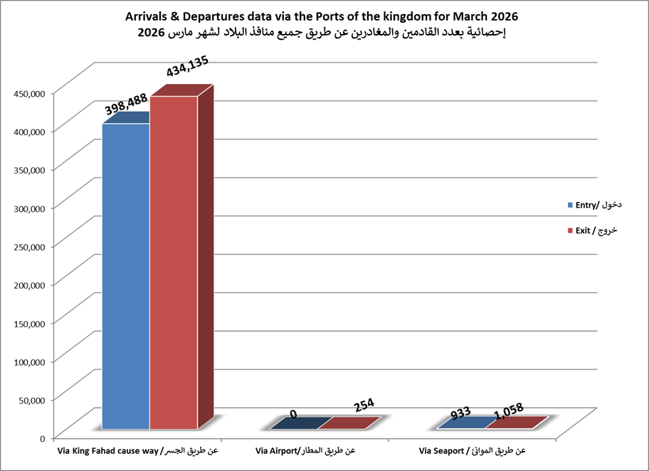 الاحصائيات الشهرية لحركة المسافرين عبر جميع منافذ البلاد لعام 2026